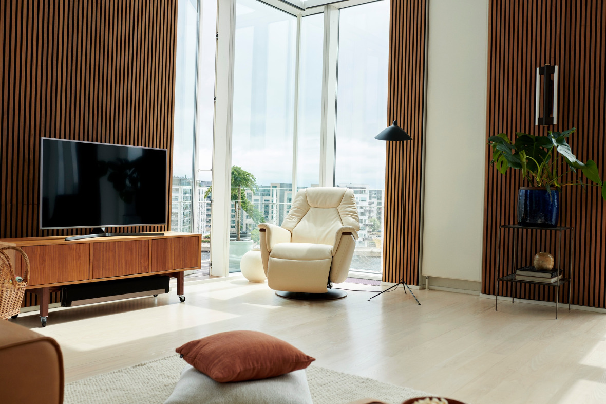Dine in comfort with Stressless® ergonomic dining chairs that are designed with the Glide® and BalanceAdapt™ systems for endless sitting positions. The 3-seater dining sofa perfectly matches the height of Stresslnd features narrow armrests and deep, soft seats.