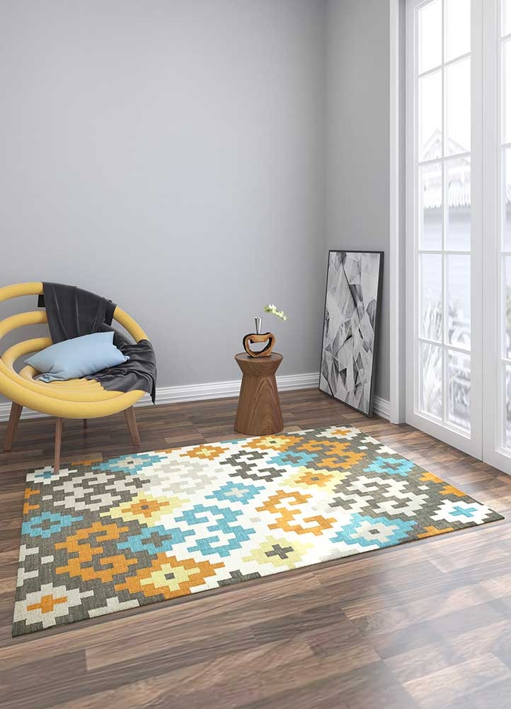 Turquoise patterned designer rug from Jaipur Rugs in living room